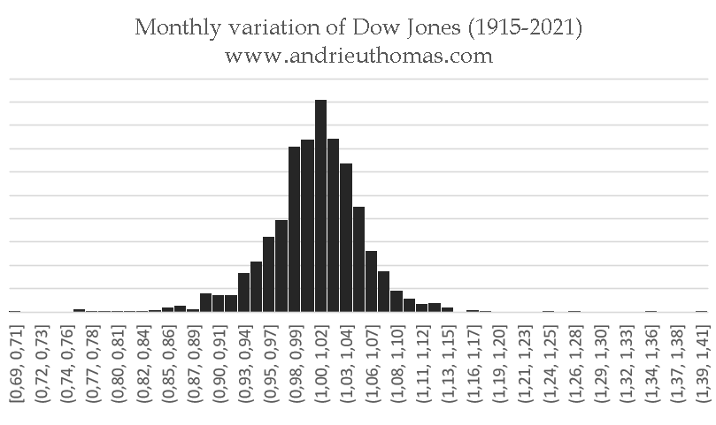 La variation mensuelle du Dow Jones suit les mêmes logiques. On s’aperçoit que plus la série statistique est étendue, plus la courbe de Gauss est exacte. Ce graphique décrit donc un manque de variations haussières entre +3% et +4%, ainsi que de variations baissières entre -4% et -5%.