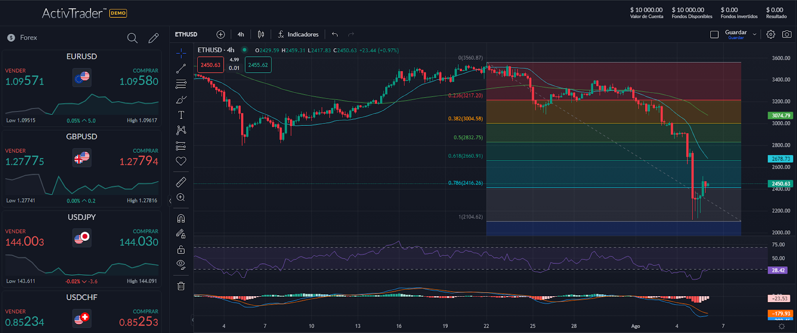 La creciente adopción de contratos inteligentes y aplicaciones descentralizadas en la red de Ethereum puede aumentar la demanda de ETH. El ETH/USD está en una tendencia bajista a corto plazo, con el precio actualmente en una zona de soporte importante (nivel 0.786 de Fibonacci).