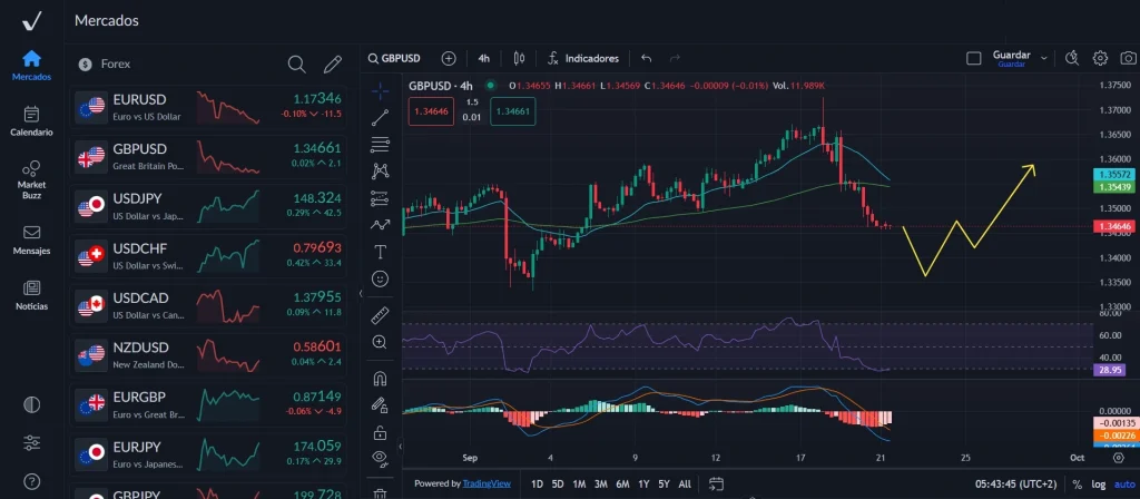 En el gráfico de 4 horas, la libra se encuentra por debajo de las medias móviles de 50 y 200 periodos, lo que refleja una tendencia de debilidad. El RSI marca niveles de 28 puntos, entrando en zona de sobreventa, lo que sugiere la posibilidad de un rebote técnico. Al mismo tiempo, el MACD confirma la presión vendedora con un cruce bajista y barras rojas crecientes en el histograma.