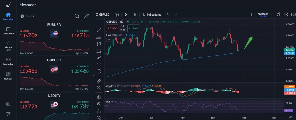 Comentario: El par GBP/USD cotiza en torno a 1.3349, mostrando un rebote técnico tras apoyarse en la media móvil de 200 periodos (1.3291), un nivel que ha actuado como soporte dinámico clave en las últimas jornadas. El reciente retroceso ha llevado al RSI a una zona cercana a sobreventa, lo que refuerza la posibilidad de un repunte en el corto plazo. Por su parte, el MACD aún refleja presión bajista, aunque empieza a mostrar señales de desaceleración en la tendencia negativa, lo que podría anticipar un cambio de impulso.