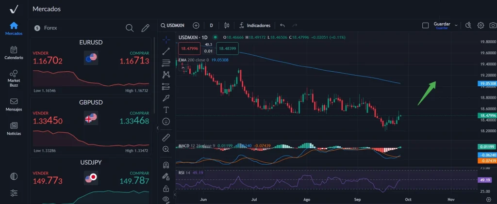 Comentario: El par USD/MXN muestra un repunte técnico tras tocar mínimos en la zona de 18.20 pesos por dólar, cotizando actualmente cerca de 18.48. A pesar de que la tendencia general se mantiene bajista al encontrarse el precio por debajo de la media móvil exponencial de 200 periodos, la presión compradora empieza a ganar fuerza y sugiere un posible movimiento hacia resistencias clave. Los indicadores acompañan esta recuperación: el MACD refleja un cruce alcista con histogramas en verde, mientras que el RSI en torno a los 49 puntos se mantiene en terreno neutral, lo que deja espacio para nuevas alzas sin entrar en sobrecompra.