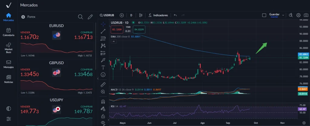 Comentario: El par USDRUB se encuentra cotizando en torno a los 83.32 rublos por dólar, consolidando una tendencia alcista tras el rebote desde los 78.00. El precio se acerca a un nivel técnico clave, la media móvil de 200 periodos (83.68), que podría actuar como resistencia inmediata y definir el próximo movimiento. Los indicadores acompañan la presión compradora: el MACD mantiene un cruce alcista con barras positivas, mientras que el RSI (62.47) refleja fuerza en el impulso, aunque cercano a zona de sobrecompra, lo que sugiere que podría producirse una ligera toma de ganancias antes de un avance mayor.