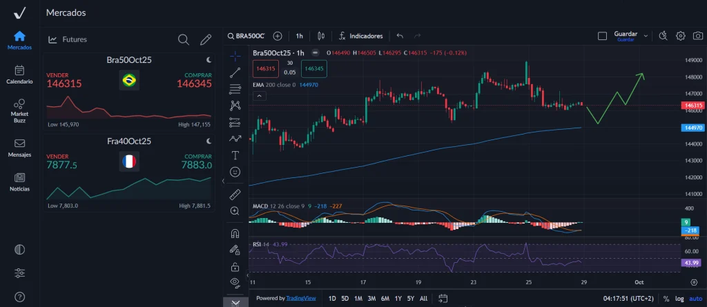 Comentario: El índice BRA50 (octubre 2025) muestra un movimiento lateral en las últimas sesiones, con el precio en torno a los 146.315 puntos. La EMA de 200 periodos en temporalidad de 1 hora se mantiene ligeramente por debajo del precio (144.970), lo que refleja que, pese a la corrección reciente, la tendencia de fondo conserva un sesgo alcista. El mercado parece estar consolidando antes de definir un próximo impulso.