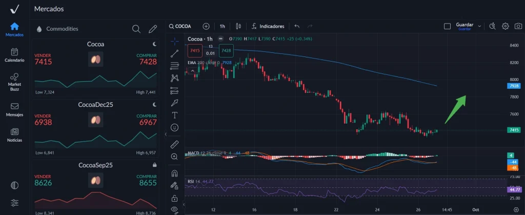 Comentario: El gráfico del cacao (Cocoa) muestra una fase de consolidación tras una fuerte corrección bajista. El precio se encuentra actualmente en la zona de los 7.415 dólares, intentando estabilizarse después de la caída que lo llevó a tocar mínimos recientes. La media móvil exponencial de 200 periodos en temporalidad de 1 hora se mantiene por encima del precio, lo que indica que la tendencia de fondo sigue siendo bajista, aunque el soporte actual está generando un posible rebote técnico.